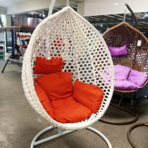 The New Hammock swing invites you to simply sit, sway and daydream away. We love how the frame is designed to cradle and the cushions are just the right amount of fluff to allow you to sink in comfortably. with a sturdy round base, this one’s great for both outdoor and indoor use thanks to its weather, water, UV, and rust-resistant properties. Available in various colors.